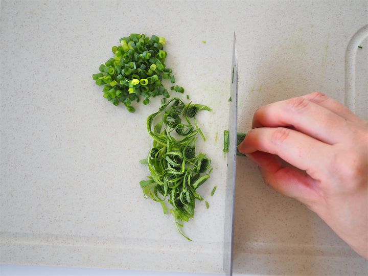 4. 青じそを千切りに、青ねぎを小口切りにする。