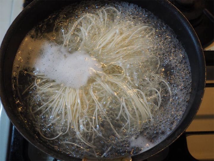 6. 鍋で湯を沸かし、そうめんを1分茹でる。茹で上がったらザルにあげ、湯を切り、鍋とザルを重ねた状態で、流水でよく洗い、ぬめりを洗い流す。
