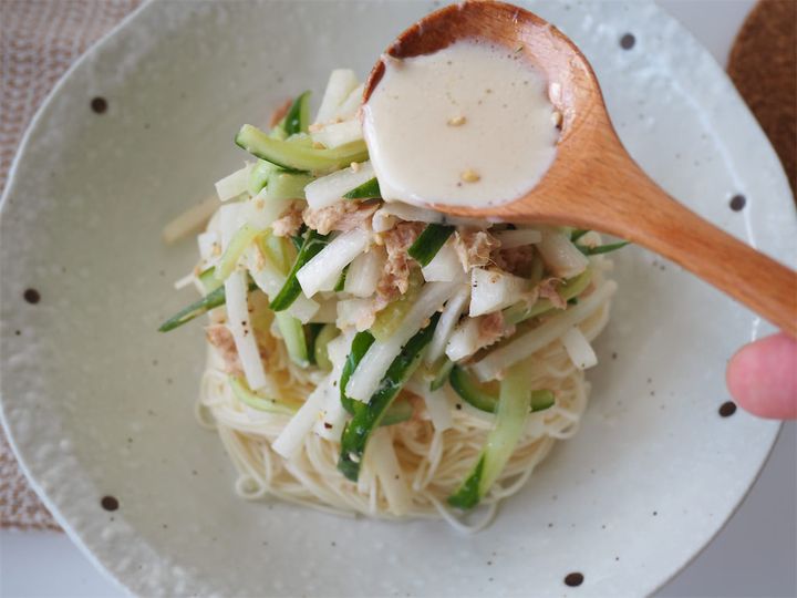そうめんはサッと茹でれば食べられて、食欲がない時でもつるつると喉を通る“夏の食卓の救世主“ですよね。今年の夏もた~くさんお世話になります!さて、今季初のそうめんレシピは、YouTubeチャンネル『くまの限界食堂』さんの「野菜のサラダ素麺」をチョイス!麺類にありがちな野菜不足(わが家だけ!?)にもうれしい、もりもりのきゅうりと大根。ツナ缶で旨味とまろやかなコクもプラスして、箸が止まらないおいしさなんだとか。見た目も涼し気でいい感じ♪さっそく作ってみましょう。