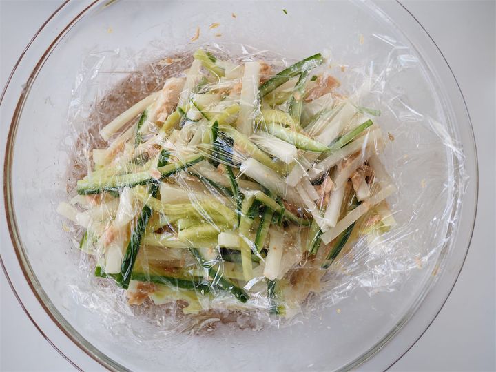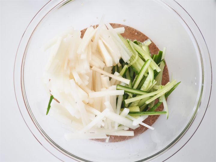 2. 大根、きゅうりを千切りにして、1のボウルの中に入れる。