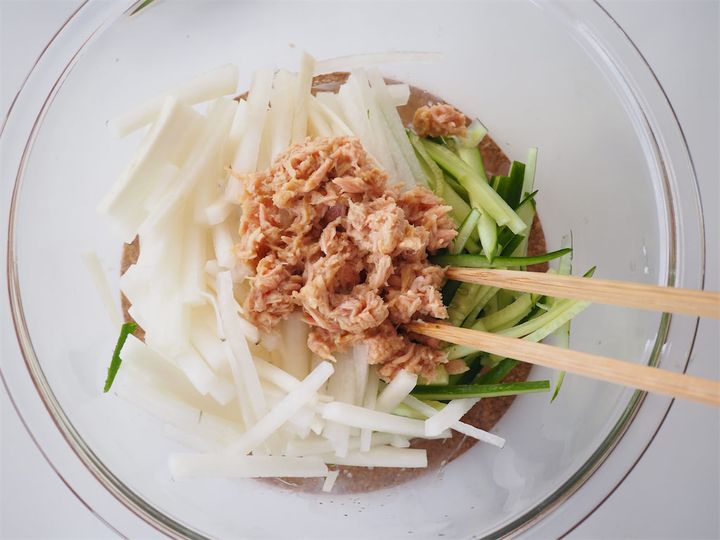 3. 【そうめんだけどポリポリ食感♪】野菜たっぷり♡ツナ和え大根の食感がご馳走の「サラダ素麺」作ろう!