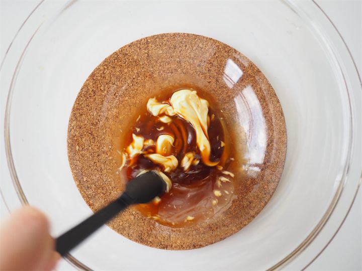 1. ボウルにマヨネーズ、めんつゆを入れて、混ぜ合わせる。