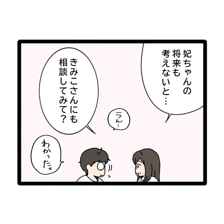 「妃ちゃんの将来も考えないと・・」そう言った後、「きみこさんにも相談してみて?」と言い、兄は、「うん・・わかった」と返事をしました。