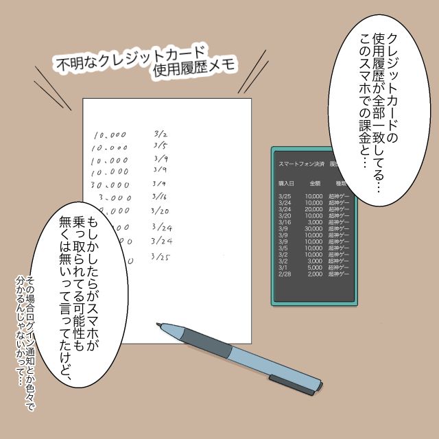 でも、クレジットカードの使用履歴と、夫のスマホの課金が全部一致したことが判明し、「もしかしたら、スマホが乗っ取られてる可能性も無くは無いって言ってたけど・・その場合、ログイン通知とか色々で分かるんじゃないかって・・」と頭の中でぐるぐる考えた後、