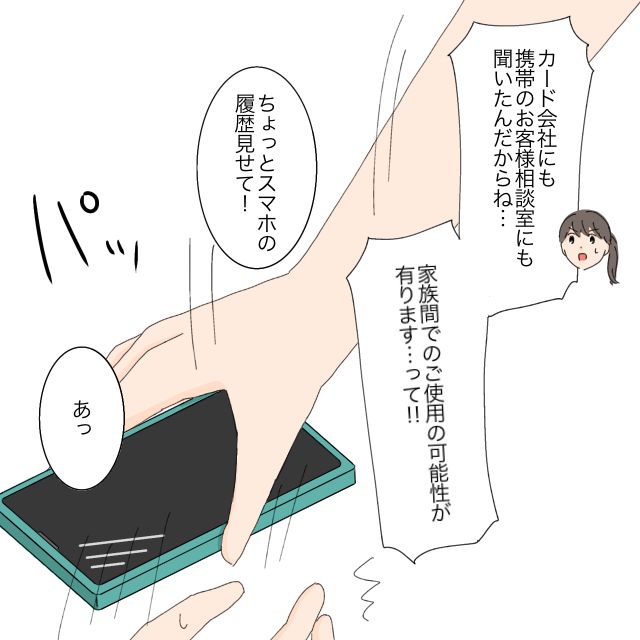 「カード会社にも、携帯のお客様相談室にも聞いたんだからね・・家族間でのご使用の可能性があります・・・って!!ちょっとスマホの履歴見せて!」そう言って夫のスマホを取り上げると、「あっ」