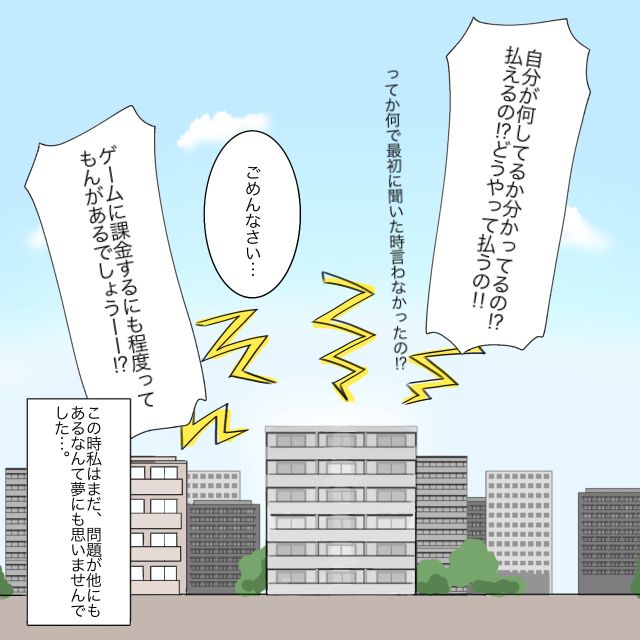 「自分が何してるか分かってるの!?払えるの!?どうやって払うの!!ってか何で最初に聞いた時言わなかったの!?」とまくしたてると、「ごめんなさい・・」と謝るも、「ゲームに課金するにも程度ってもんがあるでしょーーー!?」と課金と嘘をついたことから怒りが爆発する私は、この時はまだ問題が他にもあるなんて、夢にも思っていなかったのでした。