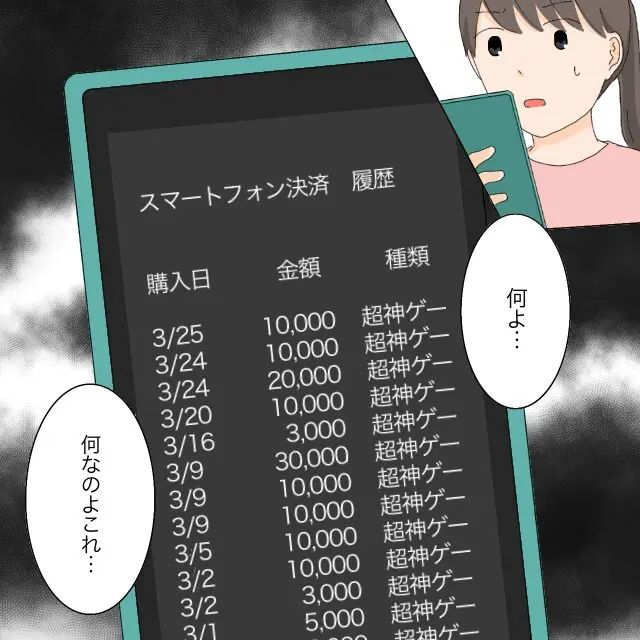 夫が小さく抵抗するのもかまわずスマホの画面を見ると、「超神ゲー」に多い時は1万円の課金が何度も!「何よ・・何なのよこれ・・」と意味が分からない私。
