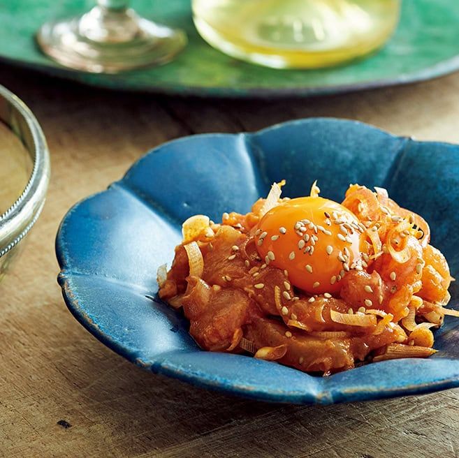 2 ボウルにAを入れて混ぜ、1を加えて和える。器に盛って卵黄をのせ、白ごまをふって食べるときによく混ぜる。