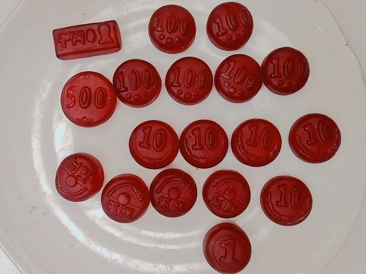 パッケージを開けると、なんとお金の形をしたグミがランダムで入ってるんです!