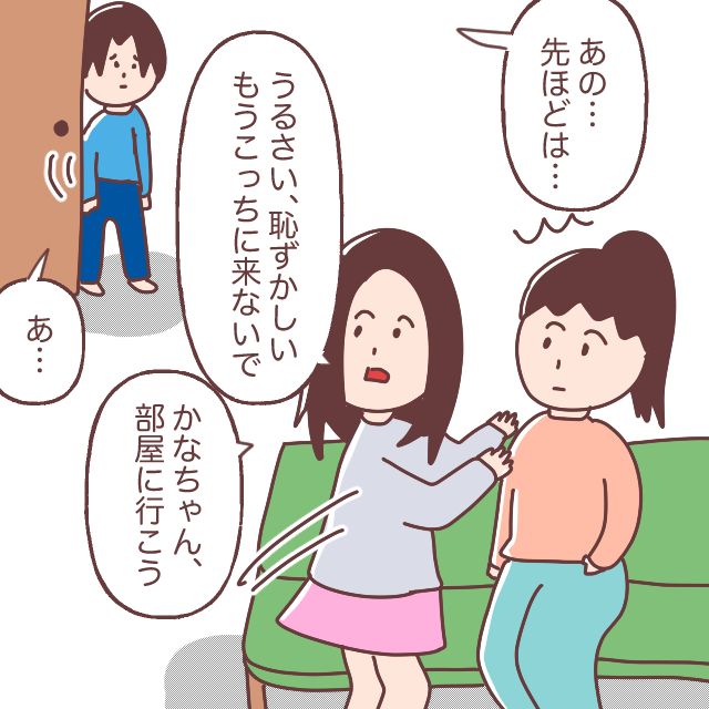 それから少しして、「あの・・先ほどは」とリビングにやって来た夫に、「うるさい!恥ずかしい。もうこっちに来ないで」そう言った後、「かなちゃん、部屋に行こう」と立ち上がる娘。それを見て「あ・・」と呟いた夫。