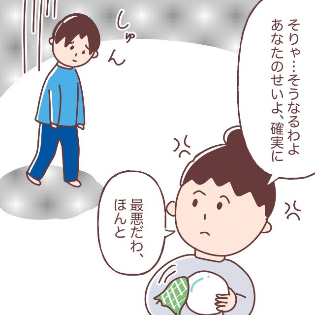 それを見て、「そりゃ・・そうなるわよ。あなたのせいよ、確実に。最悪だわ、ほんと」あれだけ言っていたのにと、呆れてそう言うと、しゅんとする夫。