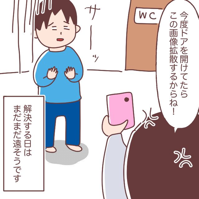 「今度ドアを開けてたら、この画像拡散するからね!」娘にそう脅されて顔面蒼白になる夫。こんな2人を見ていると、解決する日はまだまだ遠そうだと思うのでした。