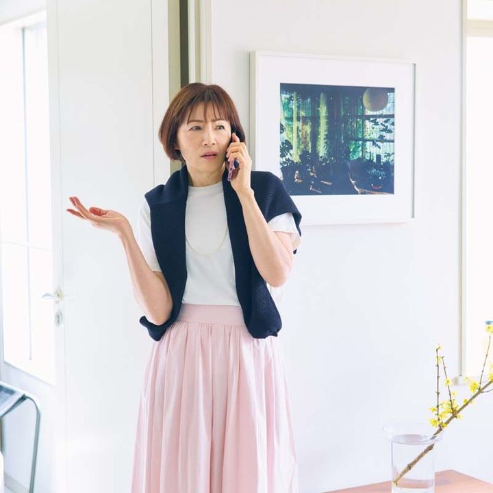 白Tにスカートのワンツーコーデでくつろいでいると、資産運用をお願いしている証券会社の担当者から「雄三さんにつながらないんです。なにか聞いてませんか?」と焦った様子で電話が。ゴルフに行ってるから、出られないのかも。そんなに急いで話があるなんてなにかしら? ネックレス¥20,350/メルセデス・サラザール(ズットホリック)