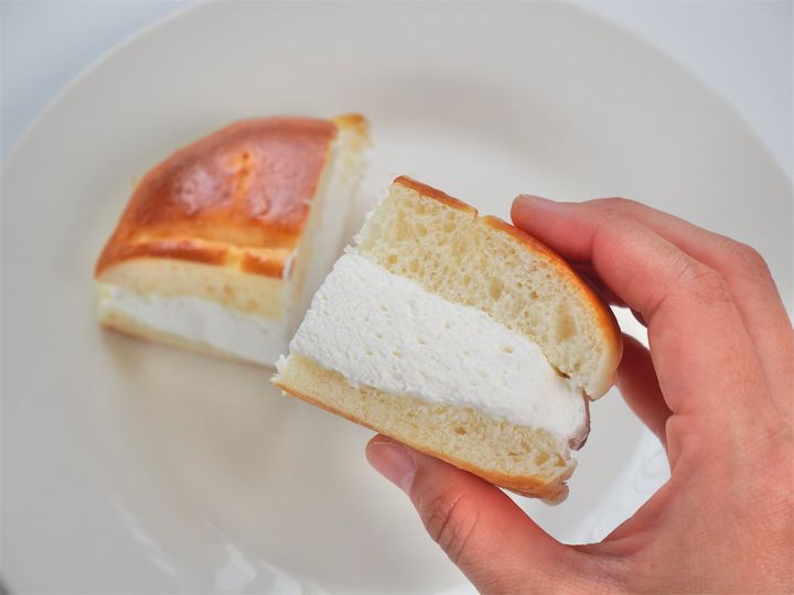 上側のパンはふわっと軽やか。対して下側はクリームとパンの重みを支えられるようにするためか、少しぎゅっと詰まったような感じ。食感はもっちり。ひとつのパンで2つの食感が楽しめます。そして何より印象的なのが、白いクリームの口どけ。ほどよい甘さと軽さがあって、大きさのわりに驚くほどパクパクと食べ進められます。