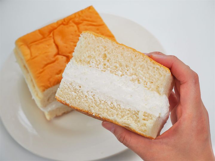 なんといっても目を引くのが、その堂々たるボリューム。手に取った瞬間、ずしっとした重みにびっくりして、思わずキッチンスケールで計ってみたところ、なんと約400g!パンの間には、真っ白でなめらかな生クリームがたっぷり。牛乳瓶のイラストが描かれたパッケージも、手にするだけでちょっとうれしくなるかわいさです。