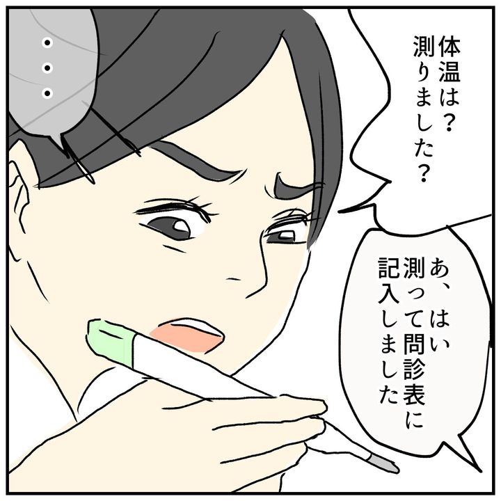 どうにか座って2人分の問診票を書けるようになったぴんさんですが、受付の人にもらった体温計では、子どもたちの熱が上手く測れませんでした。そこで、持参した体温計を使いましたが……。