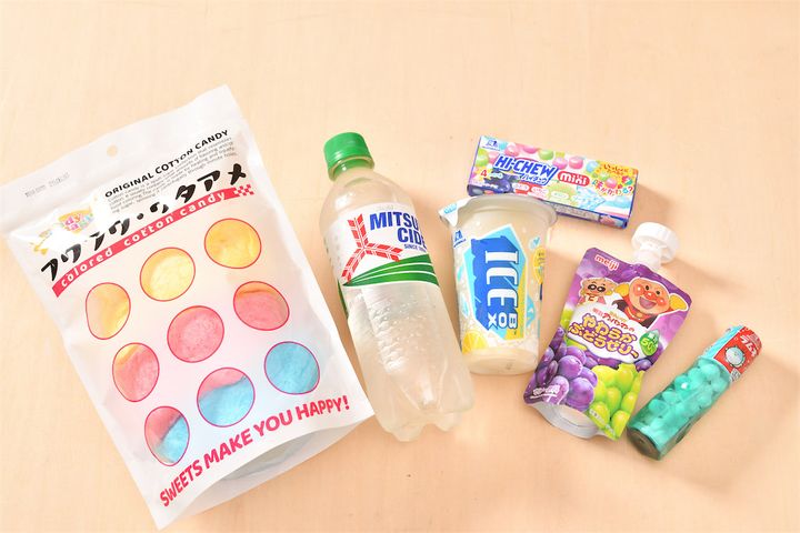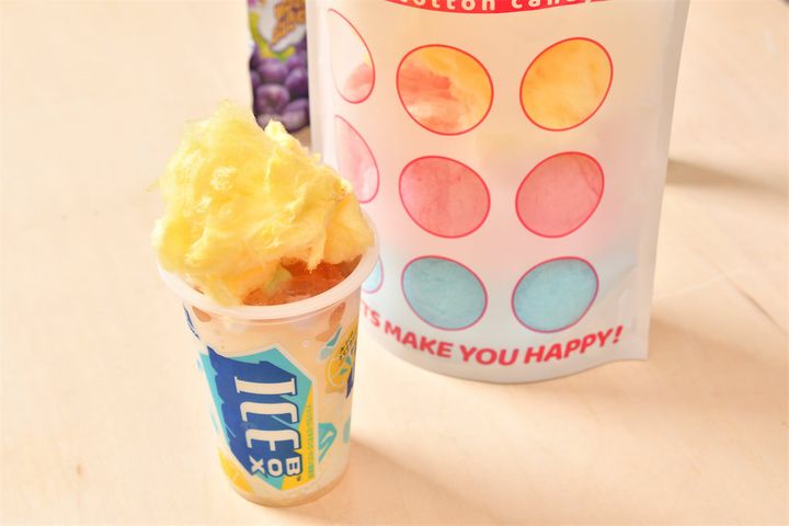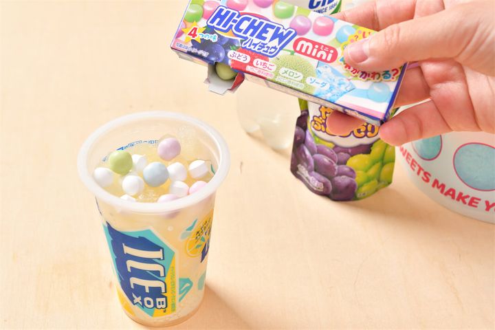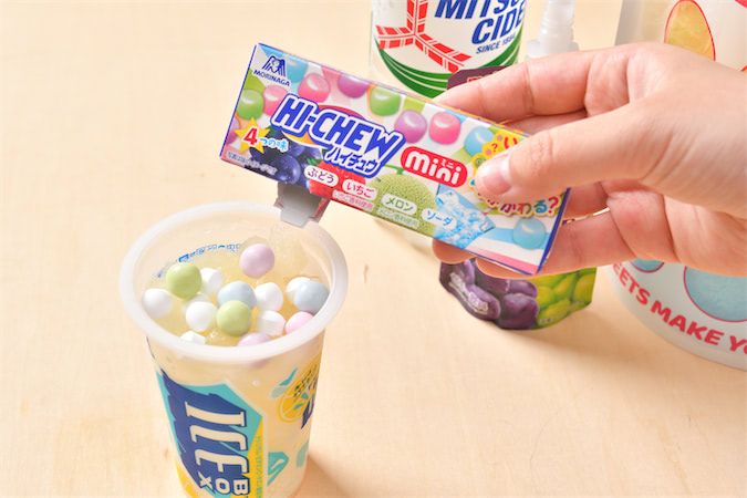 「アイスボックス」にハイチュウminiと森永ラムネ、わたあめ、ぶどうゼリー、サイダーを入れた盛りだくさんのアレンジドリンク!さっそく作ってみました!