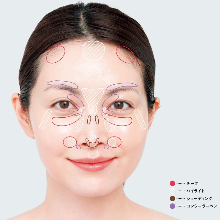 チークとハイライトで小鼻まわりのくぼみをフラットにして、鼻を目立たなくさせる