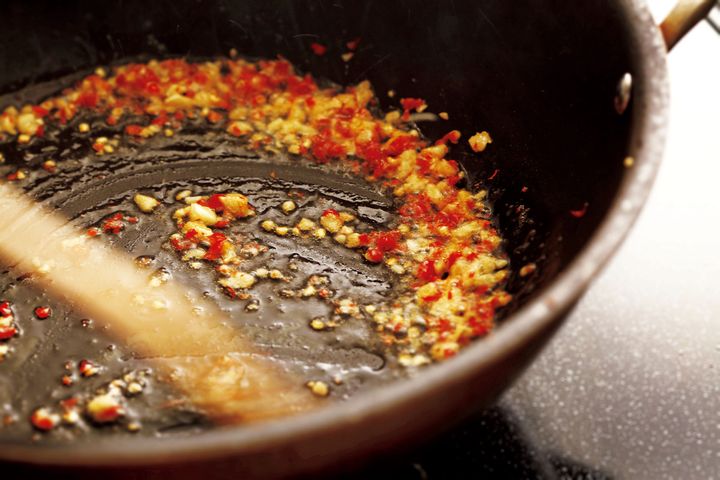 フライパンにサラダ油大さじ1を強火で熱する。赤唐辛子、にんにくを入れ、香りが立つまで炒める。