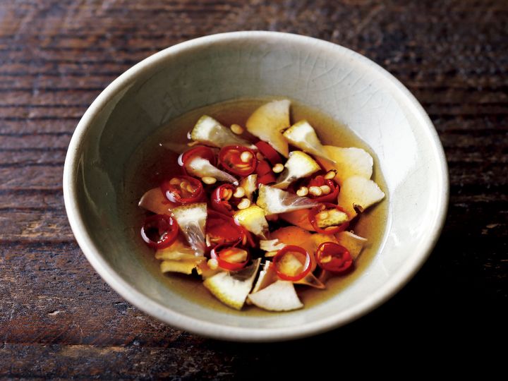 (1)赤唐辛子3本は熱湯で5分ほどゆで、種ごと薄い小口切りにする。レモン(国産)の薄切り1枚を皮つきのまま放射状に12等分に切る。