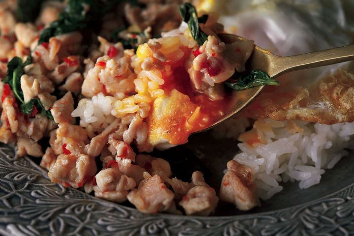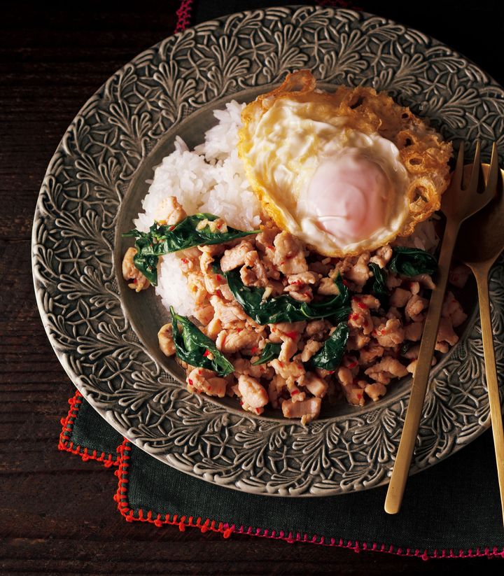 水大さじ1、バジルを加え、手早く炒め合わせる。器にご飯とともに盛り、フライドエッグをのせる。好みでプリックナンプラーをかける。