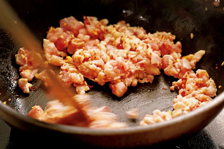 鶏肉を加えて炒め、肉の色が変わってつやが出たら、ナンプラーだれを加えて炒める。