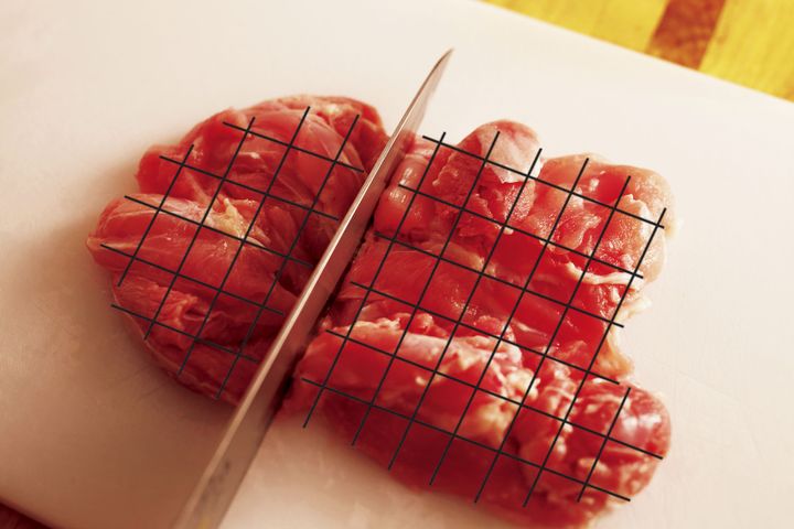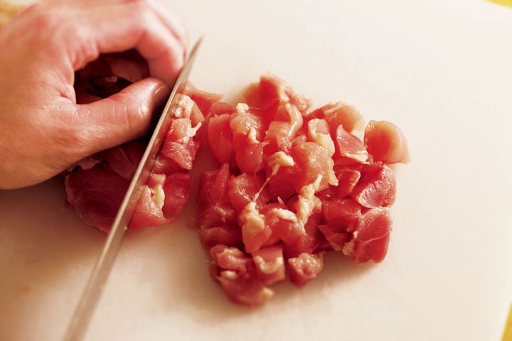 鶏肉は皮を取り、余分な脂を取り除く。まな板に横長に置いて半分に切り、繊維を断ち切りながら1cm角に切る。