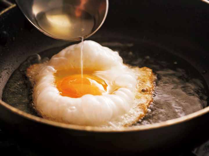 小さめの器に卵を別々に割り入れる。直径20cmのフライパンにサラダ油大さじ2を強火で1分ほど熱する。煙が立ったら卵1個を入れ、白身がふわっとふくらんだら弱火にする。おたまで黄身に油を2~3回かけ、取り出して油をきる。残りも同様にする。