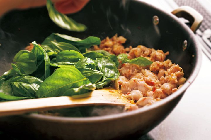(3)鶏肉、バジルを炒める