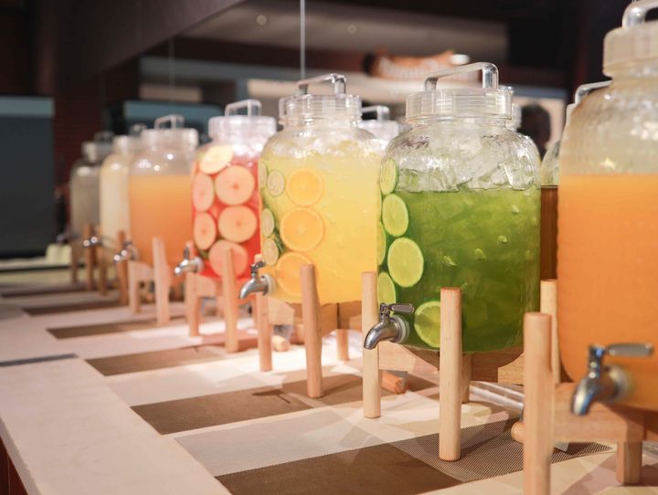 デトックスウォーターやフレッシュジュースなどが並ぶドリンクコーナーは、フォトジェニック。