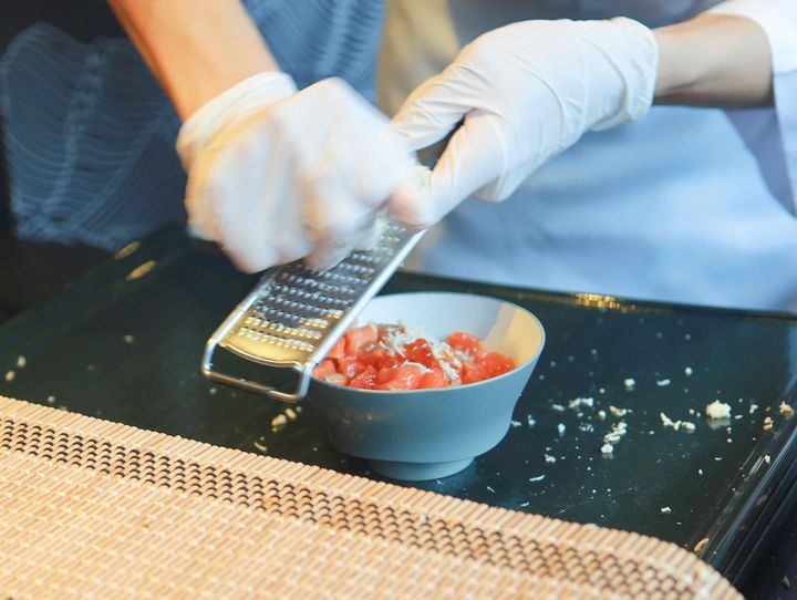 仕上げに山わさびを削ってかければ、完成!脂ののったサーモンといくらの組み合わせは、言うまでもなく絶品