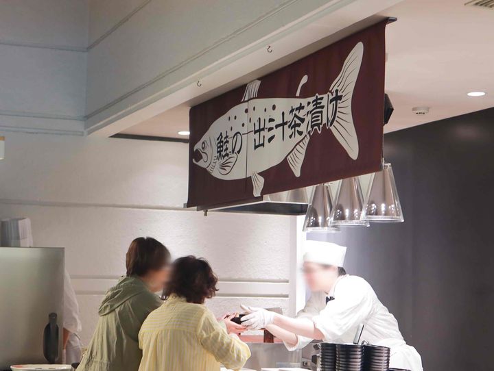 ライブキッチンで出来立てを提供している「しゃけ茶漬け」は、しゃけも丁寧に手焼きされたもの。しゃけが大胆に一切れ乗った出汁茶漬けに、山わさびや青さなどを自由にトッピングしていただきます。