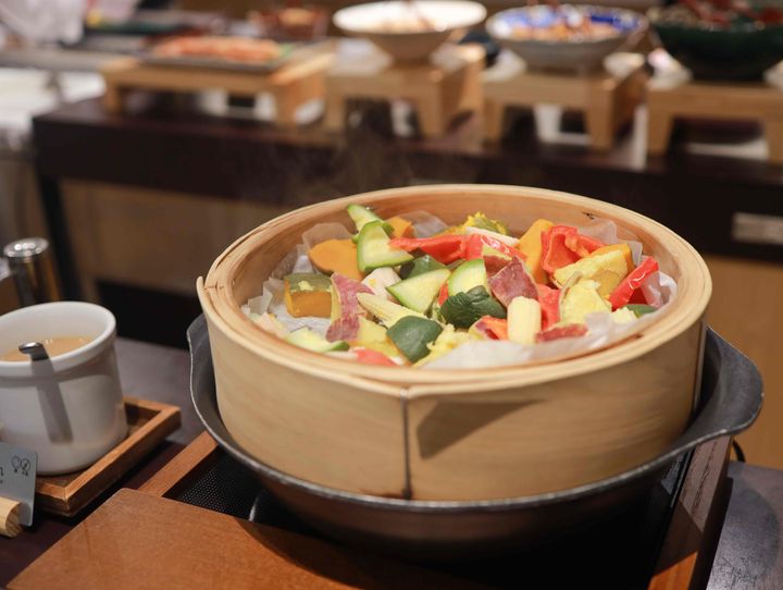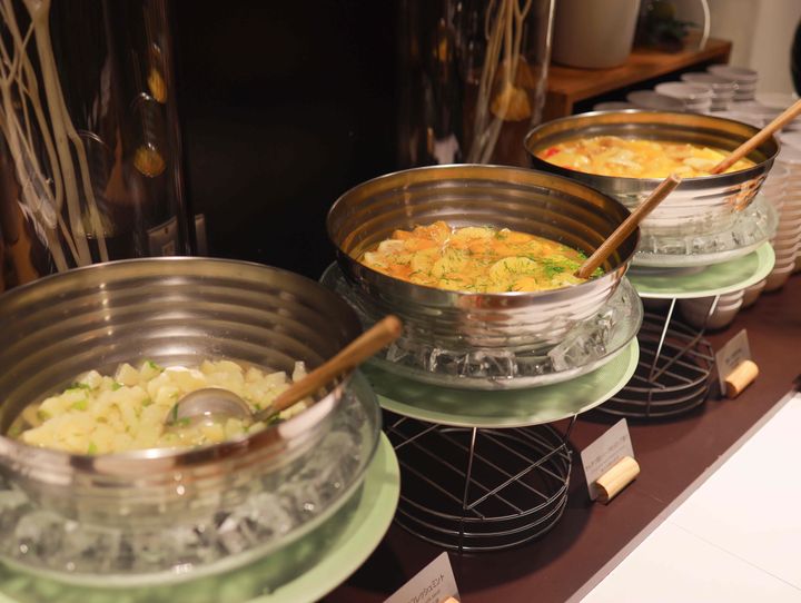 店内には、温野菜のごまだれ添えや切り干し大根・ごぼうなどを使ったおかず、焼き魚などの和食をはじめ、ベーコンやスクランブルエッグなどの洋食も並び、幅広い世代の方が楽しめるビュッフェスタイル