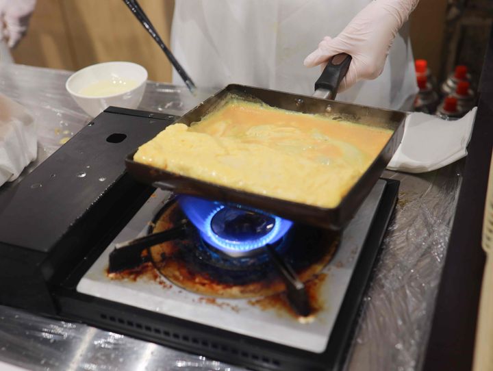 目の前でフライパンに溶き卵を注ぎ、一から作る「だし巻き卵」は、誰もが引き寄せられるインパクト。大根おろしをあわせていただきます。直火だからこそ叶うふわふわ&プルプルの食感で感動的に美味しかったです。