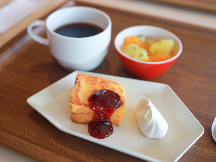 二つ目の名物グルメは「フレンチトースト」。ホイップクリームを添えて、さらにお好みでブルーベリーソースをトッピング。しっかりと液が染み込んだ、まるでプリンのような濃厚な味わいととろける食感がたまりません。小さめサイズなので、食後でもペロリといただけました!