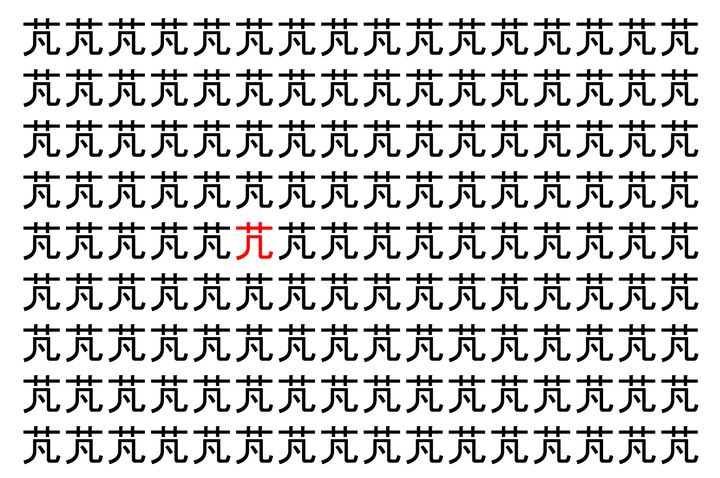 画像の中には、「芃」という漢字が縦に9行、横に16個並んでいます。 全部で144個となりますが・・・、そのうち1つは「異なる漢字」となってますよ!!