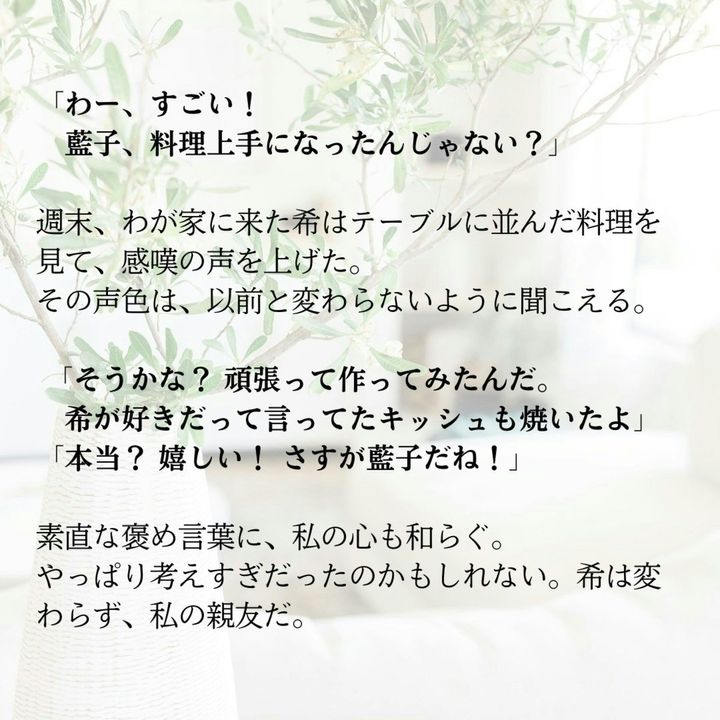 ですが、希には友人代表スピーチをお願いしています。ギクシャクしたまま結婚式を迎えるわけにはいきません。連絡をとらないまま、数日が経ったある日…希のほうから謝罪のメッセージが届きました。そして後日、改めてスピーチの打ち合わせをするため、希が藍子の家を訪れます。