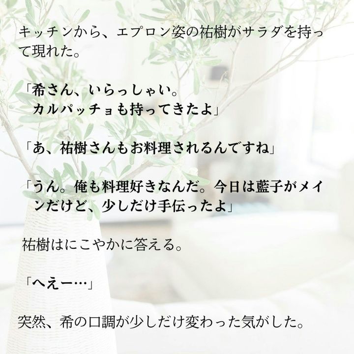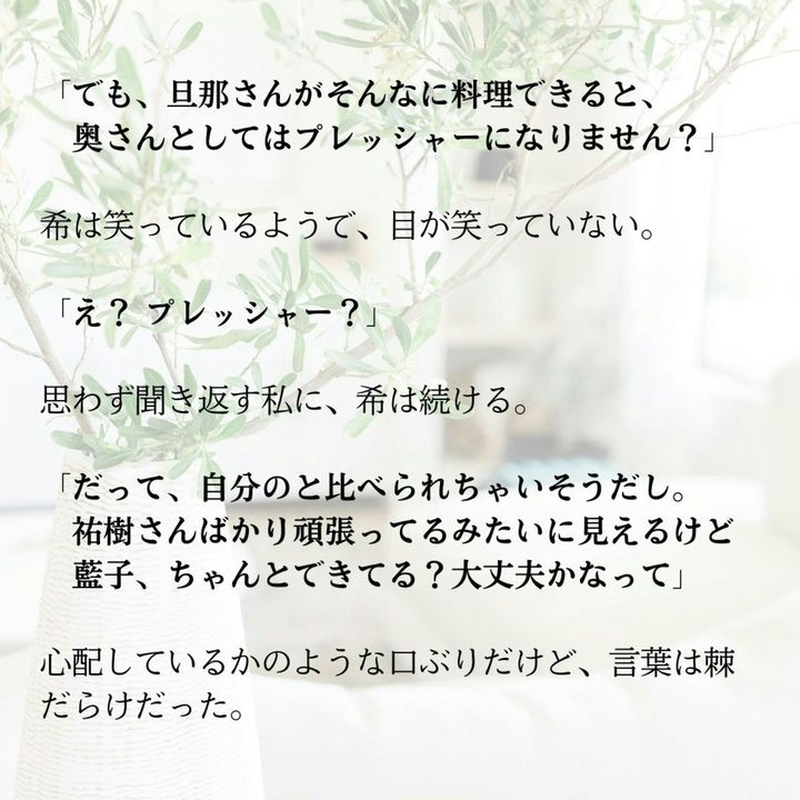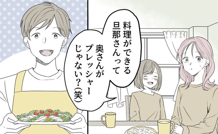 希から謝罪のメッセージが届き、ホッとしていたのも束の間…。希は家に来た途端、今度は「料理ができる夫はプレッシャー」などと言い始めました。「目が笑っていなかった」という希の様子に不気味さを感じます…。