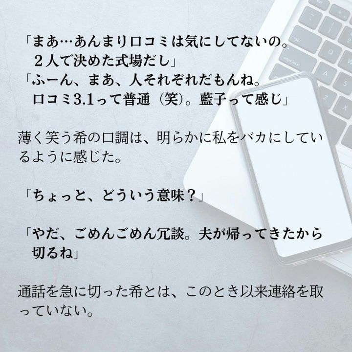 結婚を間近に控えている主人公・藍子。ところが、親友・希から、心ない言葉を言われてしまいました。「結婚式場の口コミがよくない」なんて…口出しされたくないですよね。トゲのある希の言葉にモヤモヤしてしまいます…。