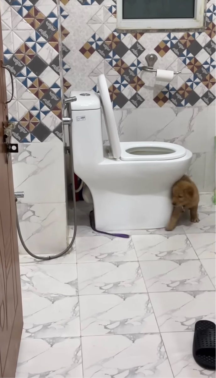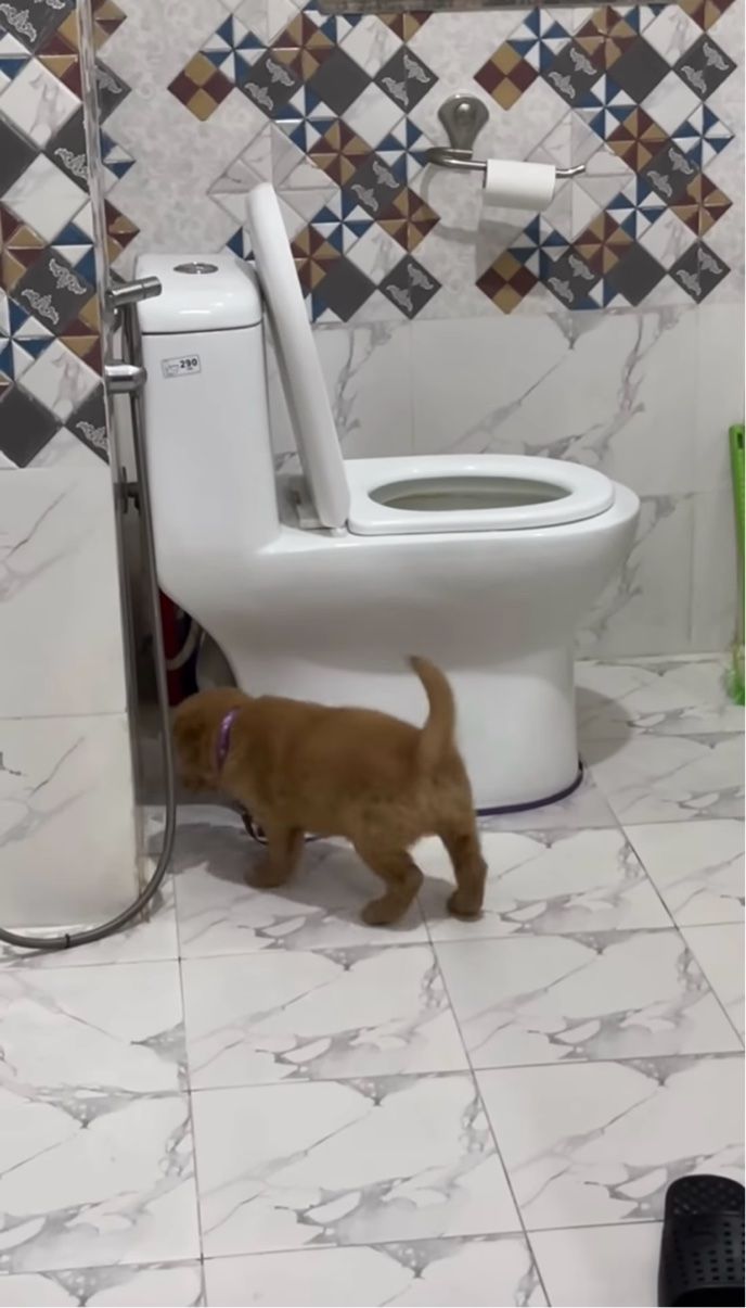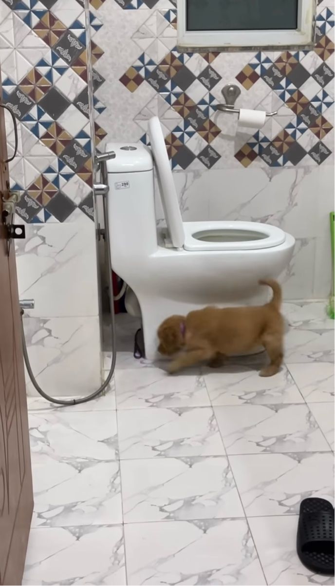 なぜかトイレの周りを回っている子犬。 よく観察すると、この子は「あるもの」を追いかけていることが判明しました!