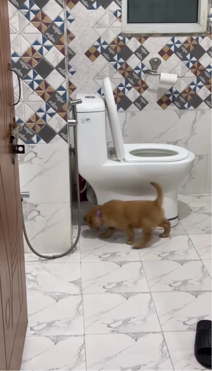 トイレの周りをぐるぐる回り続けていた子犬。 不思議な行動をとっていましたが、実は、「あるもの」を夢中になって追いかけているところだったのです!