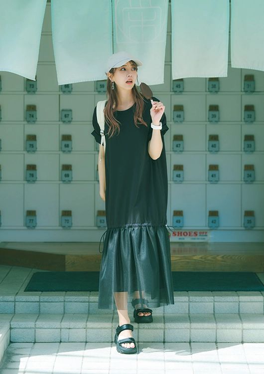 楽チンなTシャツワンピも裾のチュールのおかげで手抜きに見えなくて優秀!キャップ&サンダルでとことんカジュアルに。カラーは子どもっぽく見えないようにモノトーンでまとめて。