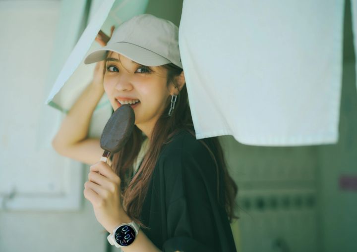 Tシャツワンピース¥5,999/アース ミュージック&エコロジー(アース ミュージック&エコロジー 東京ソラマチ) リュック¥21,450/ダイアナ(ダイアナ 銀座本店) スポーツサンダル¥8,800/オリエンタルトラフィック(ダブルエー) キャップ¥4,499/デッサン(ワールド) チェーンピアス¥13,200/ステラハリウッド スマートウォッチ vivoactive 6 ¥52,800/ガーミン