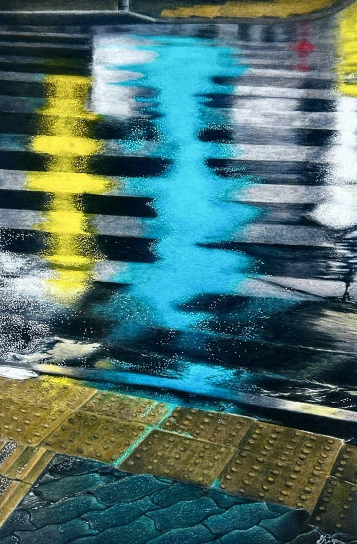 色鉛筆で描かれたとは信じがたい…。少し汚れた点字ブロック、横断歩道手前の水が溜まった箇所などが特に写真のように見え、奥は路面が濡れ光の反射が幻想的な雰囲気に。手前の現実感と奥の幻想的な風景に、見れば見るほど引き込まれました。
