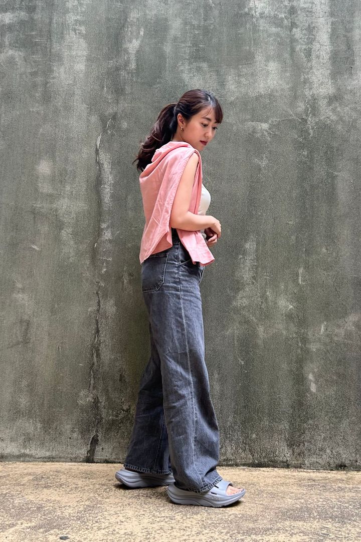 エディターは黒のジーンズパンツ×白のサテンタンクトップ、ピンクのシャツを肩から掛けたコーデと合わせてみた。コントラストが強すぎないグレーのサンダルが、ピンクやホワイトの柔らかい色を引き立ててくれて、全体のバランスが丁度よくまとまった。また、サンダルに“抜けすぎ感”が出ないので、大人のリラックスコーデとも相性◎。