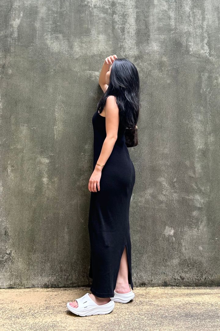 エディターは黒のタイトワンピースに合わせてみた。上品で女らしい黒ワンピースに、あえて白のサンダルを合わせることで、ほどよくカジュアルダウンさせ爽やかさをプラス。また全体が重たくなりがちな黒ロングワンピも、白いサンダルを合わせることで、軽さのあるスタイルに仕上がった。
