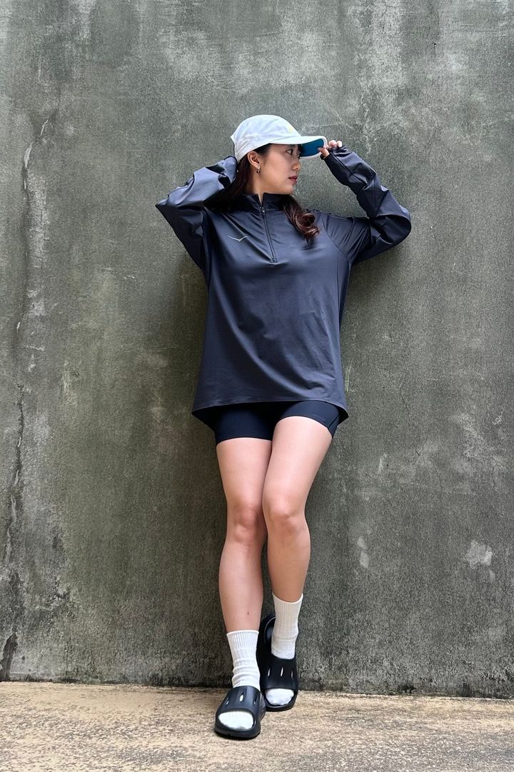 エディターは黒のハーフジップ×黒バイカーショーツに、白キャップと白ソックスを合わせて軽さを出したスポーティなコーデに。ピラティスやジムに行く日も、リラックスした足元でいられるのは魅力的。厚めのソールがさりげない脚長効果を出してくれるのもうれしいポイント。