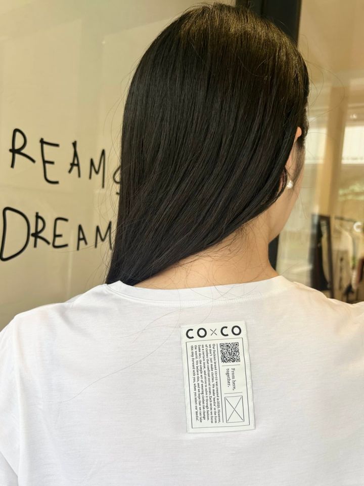 「コットン100%でほどよいハリ感が気に入っているココのTシャツ。ココは発展途上国の女性の雇用問題や、アパレルの生産過程における廃棄物の問題など、あらゆる社会問題に対して、洋服を通して考えてもらいたいと思い立ち上げたブランドです。このTシャツのアイコニックなタグにあるQRコードを読み取るとそういったブランドのストーリーを見ていただける仕掛けになっています」Tシャツ¥12,650(ココ)
