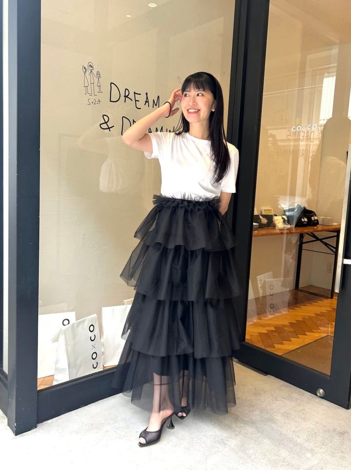 「シンプルな白Tシャツだからこそ、永遠の定番アイテムになるよう素材選びやデザインにこだわった一枚です。エレガントなチュールのスカートにもあう、カジュアルすぎない生地感もポイントです。スカートが華やかな分、色みはシンプルにモノトーンでまとめています」