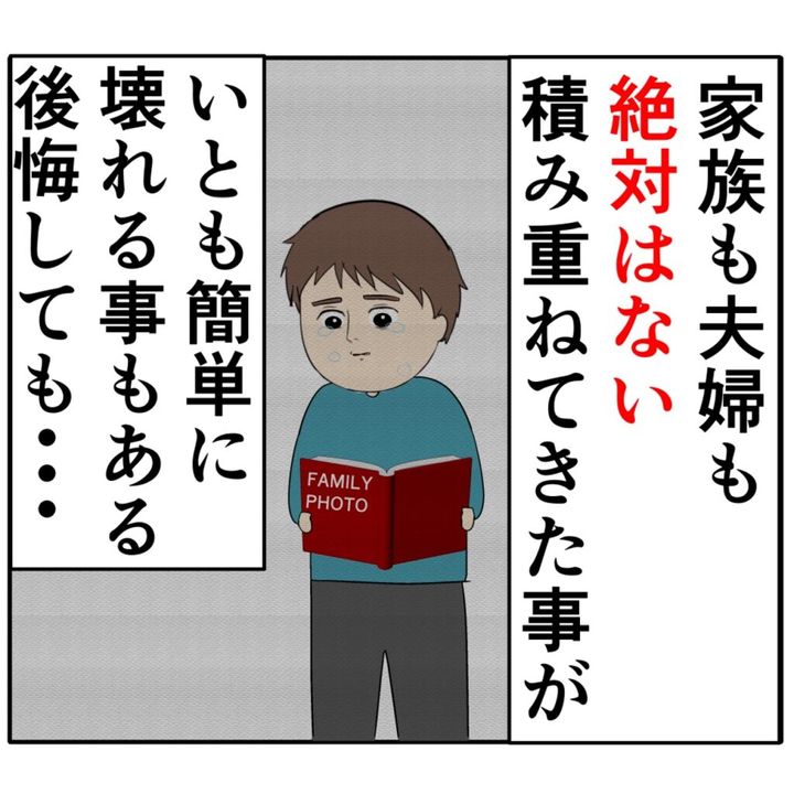 自分の行動の結果、そして自分で決断した離婚だと分かっていても、家族との楽しかった思い出ばかり思い出されて、ろみ緒さんには後悔しかなく、涙が止まらないようですね。
